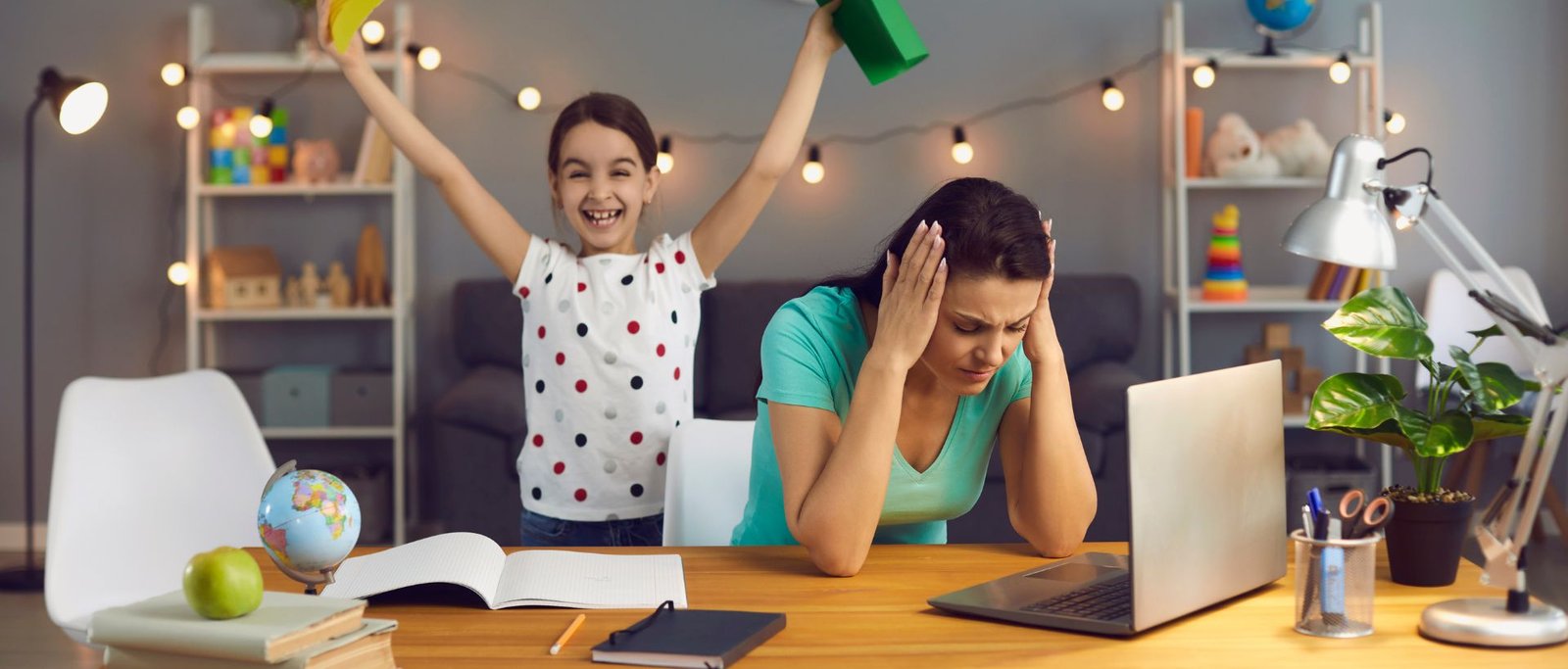 Mère épuisée devant son ordinateur, submergée par la charge mentale du travail, tandis que son enfant joue bruyamment à côté.